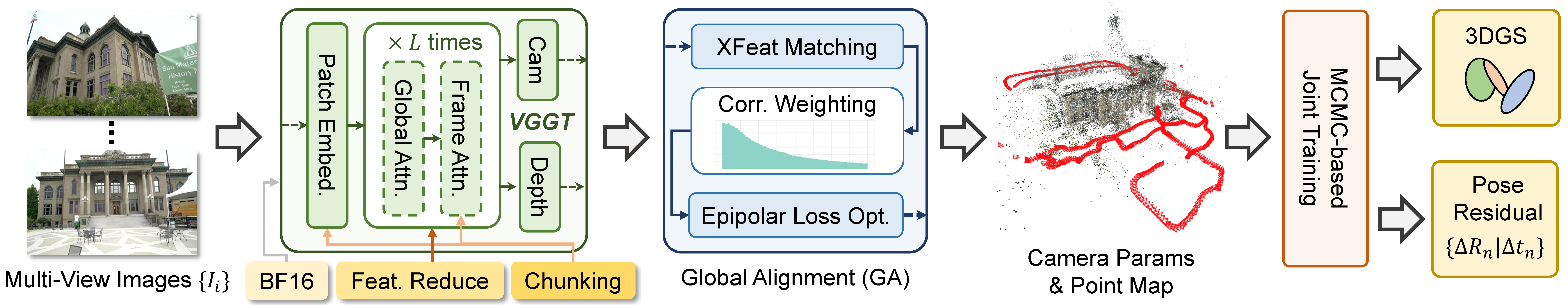 VGGT-X takes dense multi-view images as input. It first uses memory-efficient VGGT to losslessly predict 3D key attributes, which we name as VGGT--. Then, an fast global alignment module refines the predicted camera poses and point clouds. Finally, a robust joint pose and 3DGS training pipeline is applied to produce high-fidelity novel view synthesis.