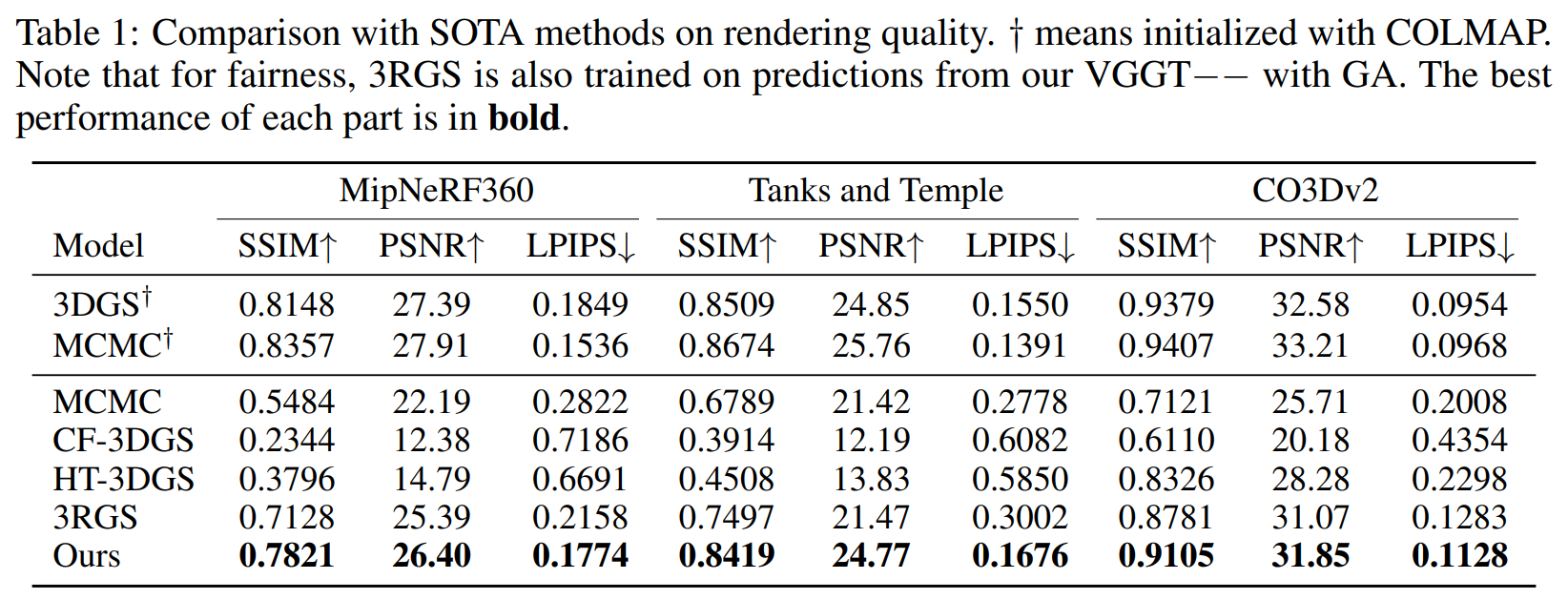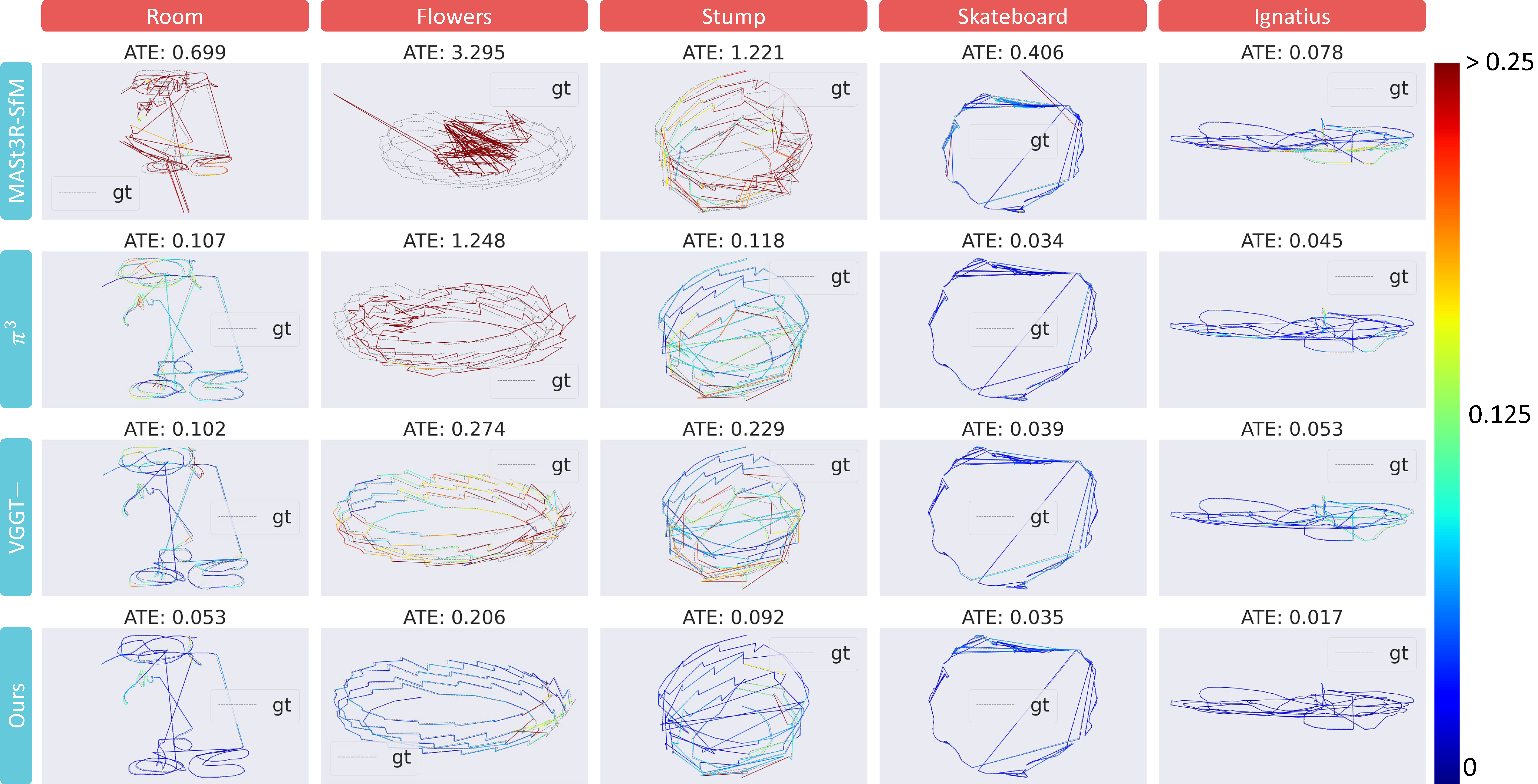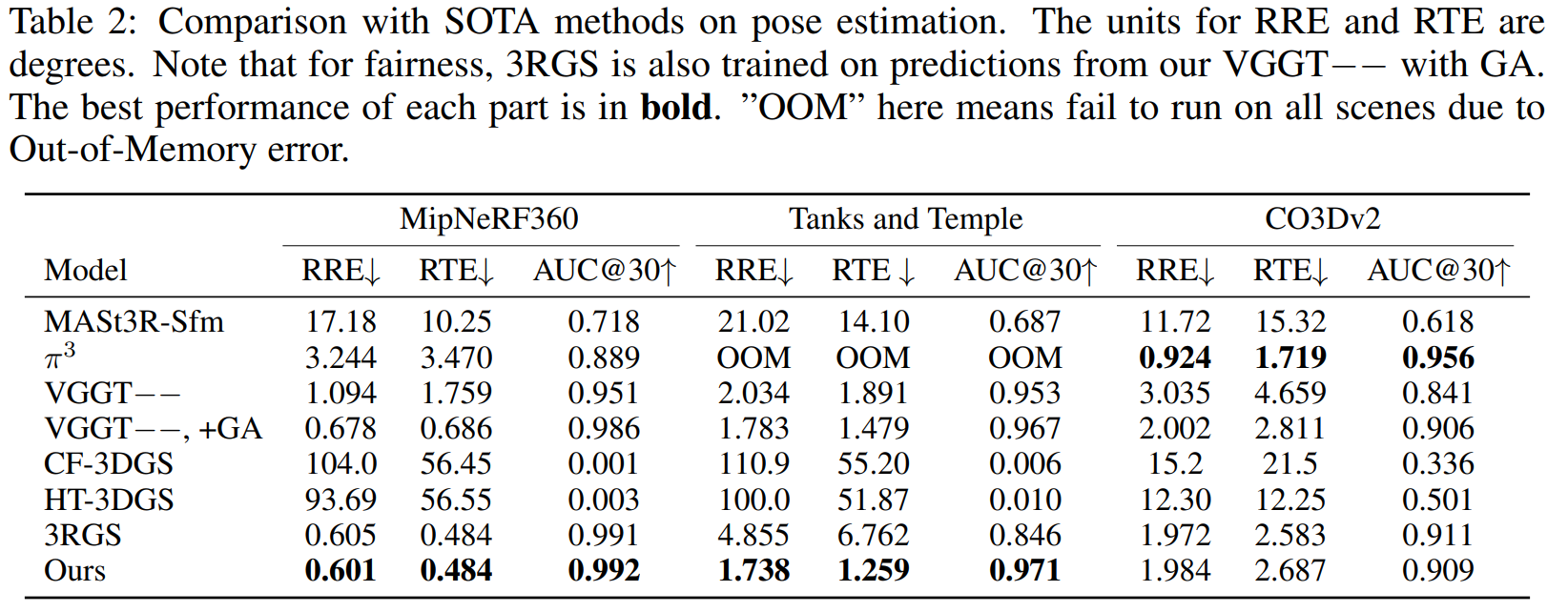 VGGT-- here denotes our memory-efficient VGGT implementation. GA here denotes Global Alignment. The ablation and bad case analysis in our paper also shows performance discrepancy between training set and test set, indicating overfitting problem and joint pose and 3DGS optimization dilemma.